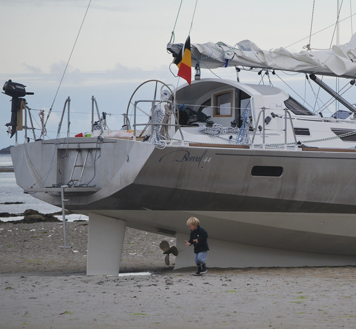 船舵是指船隻尾方水中的可移動板。圖片中是型號為Boréal44的遊艇,長13.8公尺,船尾下方的船舵與一位小男孩等高。圖片來源:Boréal SARL