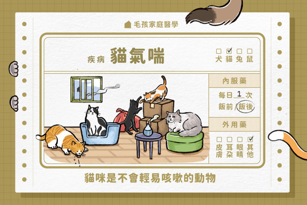 臺灣地狹人稠空汙容易累積、民眾有在室內焚香或抽菸的習慣、多貓家庭若是空間不足容易造成貓咪壓力大而影響上呼吸道病毒傳播等等,或許多多少少都讓貓咪更容易出現呼吸道疾病,也包括了氣喘。
